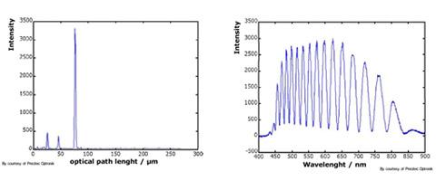 On each interface between different layers a part of the incident polychromatic light is reflected. A phase shift appears that varies with the wavelength. At certain wavelengths constructive interference occurs, at other wavelengths interference is destructive. The optical path length can be calculated from the intensity of the interference signal as a function of the wave number.