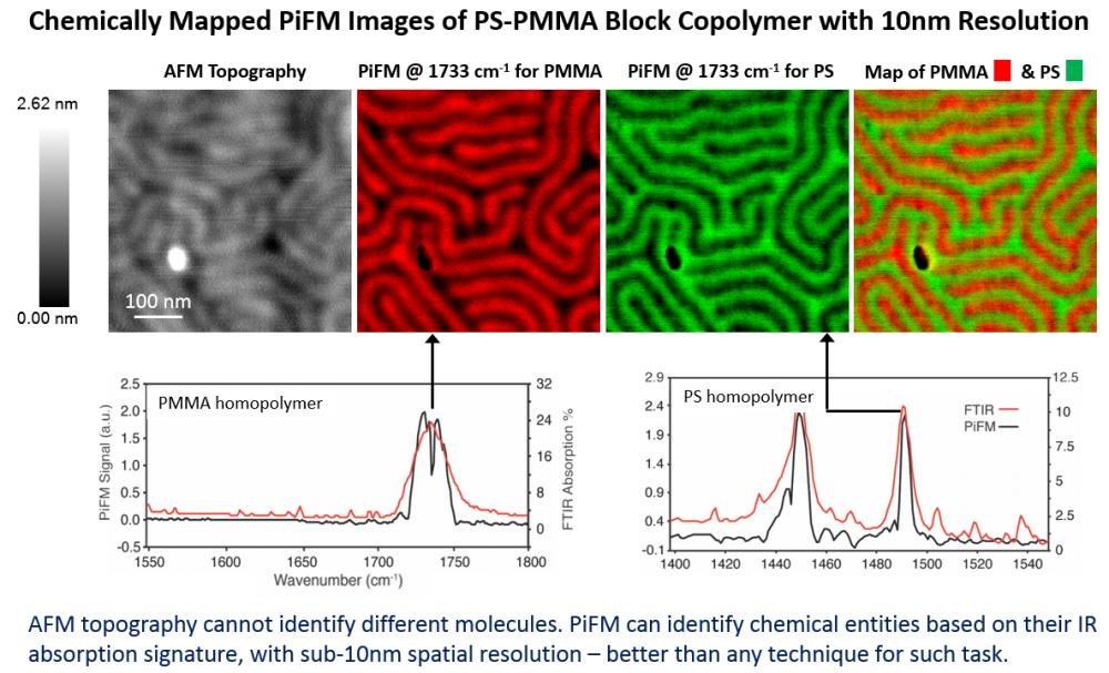 The PiFM images selectively display the polymeric species based on their absorption wavelengths with spatial resolution that is ~ 1000x smaller than the wavelengths, resolution not obtainable with any other techniques. Note that the topographical features mainly track the PMMA domain; some of the tall defects in topography show up as correlating defects in the PS image whereas they are not as obvious in PMMA image. In addition to high resolution spectral imaging, absorption spectra that correlate well with bulk FTIR spectra can be acquired from nano-spots in second(s) without damaging the samples.