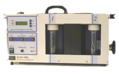 This tritium sampler brings original solutions in the exploitation of trapping systems for tritium gas and tritiated water. This collection system is mainly used for the detection of chimney rejects and TRITIUM wastes degassing. The realization of this machine has been essentially focused on optimum sampling efficiency associated with ergonomics adapted to all utilization conditions. The technician can come less frequently to collect the liquid solution (monthly instead of a usual weekly frequency) thanks to a cooling system water circuit that will prevent all water loss by evaporation in the feeding-bottles. Its original tightness dynamics system on the two feeding-bottles, authorizes a manipulation (on/ off) particularly confoftable of this device in all circumstances without pressing back nor loss of solution. A microprocessor pilots and manages all functioning parameters, insuring thus a total security in its utilization during long periods.